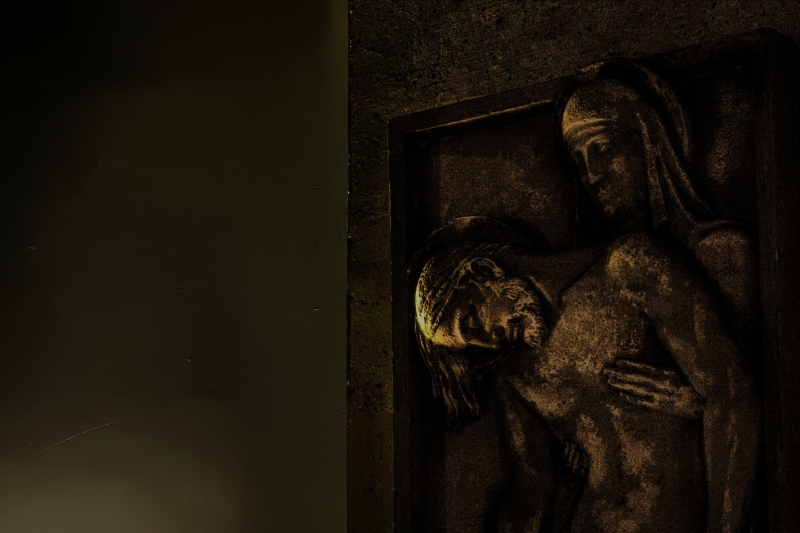 Nonostante la penombra, l'emergere di tratti di luce dorata, su linee precise dei particolari scolpiti, non ha cupezze, ma appare semplicemente come una quieta meditazione visiva. Due corpi, due pienezze, contro il vuoto che hai composto a lato, che ci raccontano la compassione vera, il voler raccogliere il dolore dell'altro per trasformarlo, estrarne lo spirito più umano.