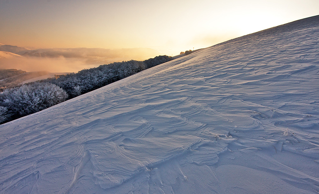 Il pp è stupendo con il gioco grafico della neve ventata dove i particolari sono ben evidnezati dalla luce radente, così come sono piacevoli le montagne in lontananza immerse nelle nuvole. La zona bruciata avrebbe (secondo me) dovuto essere contenuta, cercando una qualche soluzione magari in una doppia esposizione (anche in post-eventualmente).