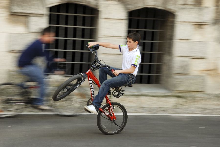 Lo scatto ci presenta il gesto di equilibrio di un giovane ciclista, ripreso bene a fuoco e impreziosito da un ottimo panning, restituendo una scena dinamica e coinvolgente. Mi rimane impressa quella ruota posteriore sgonfiata, come se fosse un artificio messo in atto per aiutare la prestazione di impennata. La composizione fotografica si caratterizza per la eccessiva centralità del soggetto, per la parziale sovrapposizione con l'altro ciclista dello sfondo, per una lieve pendenza verso destra e per un taglio audace sul bordo sinistro del fotogramma. Queste piccoli dettagli sarebbero stati evitati con un'inquadratura spostata maggiormente a sinistra che, tenendo conto dell'effetto panning, non sarebbe stata semplice nell'esecuzione. Forse se avevi una focale più grandangolare saresti riuscito a gestire meglio tutte queste variabili e a perfezionare la tua già buona prova.