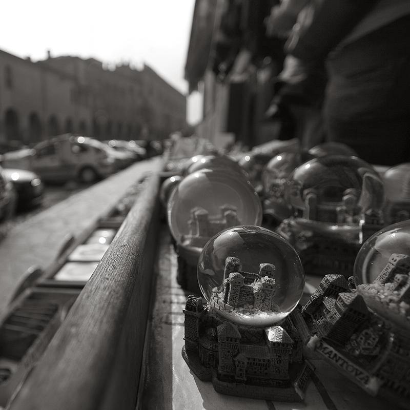 Sto riflettendo se fosse più opportuno averla lasciata a colori. MI pare un soggetto più adatto al colore o tuttavia ad una parziale desaturazione per mettere in contrasto il mondo un po' magico dei souvenir con tanto di neve dentro a quello invece grigio e anonimo della strada con le auto in sosta. Mi pare anche che lo sfuocato in primo pino a sinistra nuoccia un pochino.