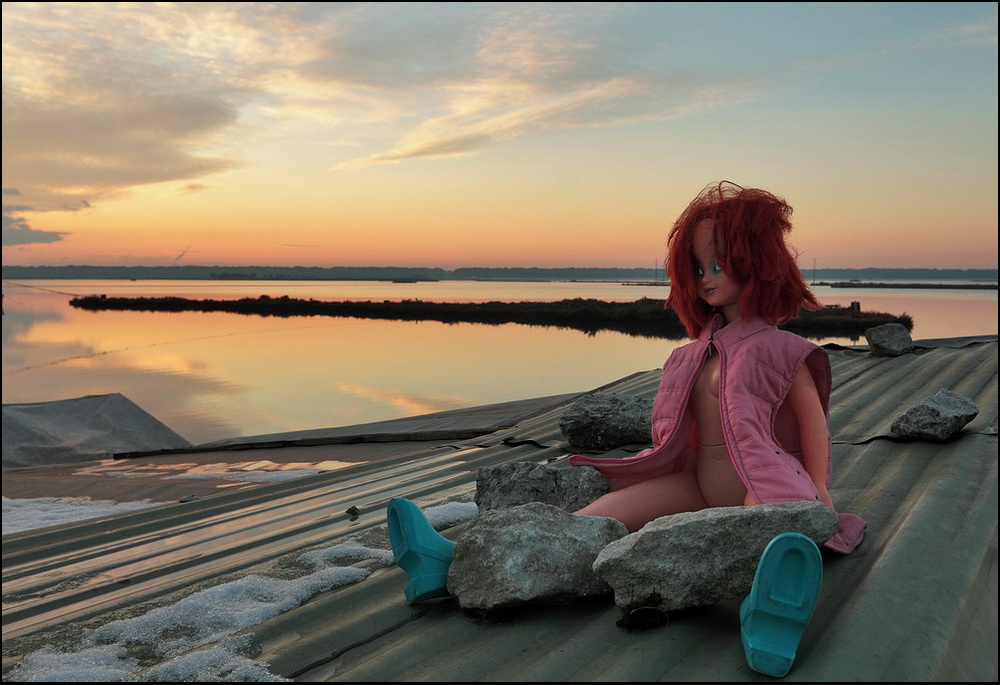 Una velina di valle, abbandonata così, discinta e sinistramente sorridente, come una strana sirenetta a monito stridente sulle tinte romanticheggianti di un tramonto speciale.