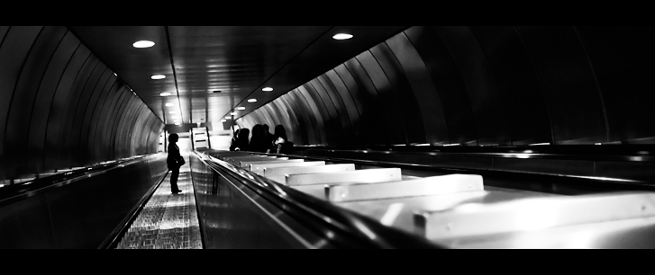 Il fotogramma dal formato anomalo e dalle piccole dimensioni risulta ben strutturato: il punto di vista e la relativa inquadratura coinvolgono l'osservatore e lo proiettano verso la silhouette della donna che riesce a staccare benissimo dallo sfondo chiaro, in misura minore verso il gruppo delle persone sulla destra importantissima la sua presenza per restituire una funzionalità allo scatto. Il bianco e nero restituisce un testo visivo interessante dove lo sfuocato del corrimano in primo piano rimanda al fuoco e ai contrasti cromatici di chiaro e scuro sullo sfondo. Leggera pendenza verso sinistra. Sarebbe stato più interessante vederlo a dimensioni maggiori.