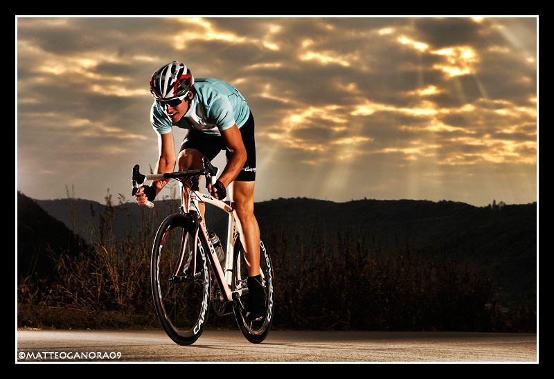 Mmmmmhhh, mi piace come il ciclista e la bici staccano dallo sfondo, la luce che filtra fa le nuvole, però forse c'è un'atmosfera un pò cupa....non dico che non mi piace, però fà strano.  |