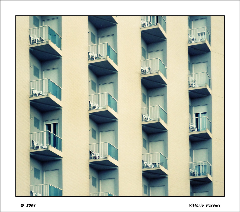 per quanto riguarda il taglio ho preferito questo perche' altrimenti avrei perso i due estremi della foto che secondo me' accoppiano bene con i tre muri che separano le quatttro file di balconi.