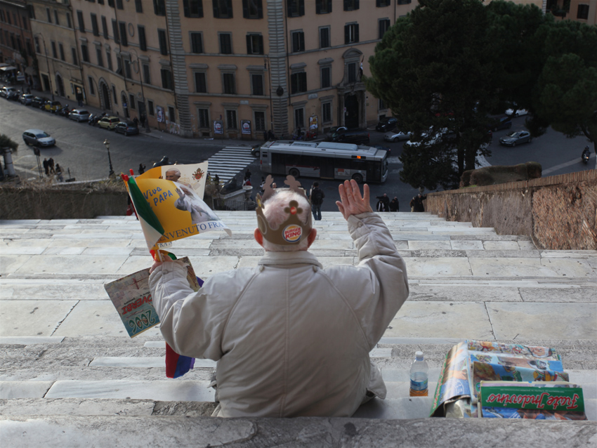 @Ueda scrive : "un pò di folla in più, come fedeli e più macchine, rendeva scenograficamente più interessante il fondale...un bel contrasto con la pulizia e l'ordine del pulpito del Papa!!" ho cercato che il luogo fosse il più vuoto possibile proprio per ironizzare ed evidenziare il contrasto tra il Papa con le sue immense folle ed una persona intenta a benedire una scalinata vuota.