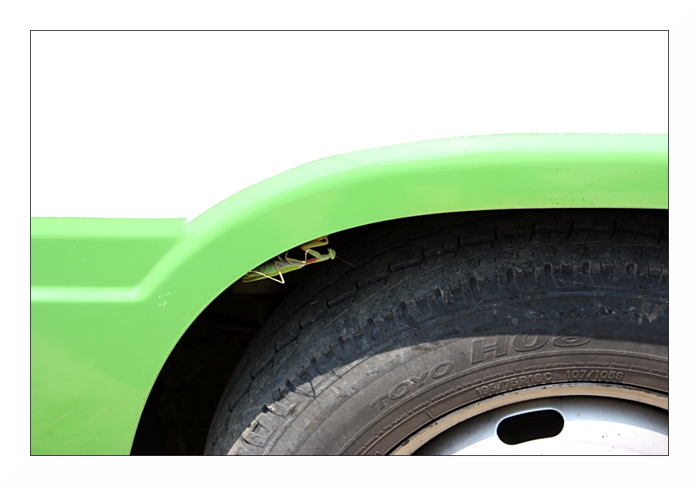 La foto ritrae un'insolito e "rischioso"appostamento per questa mantide che forse è rimasta attratta da un famigliare colore verde... ...