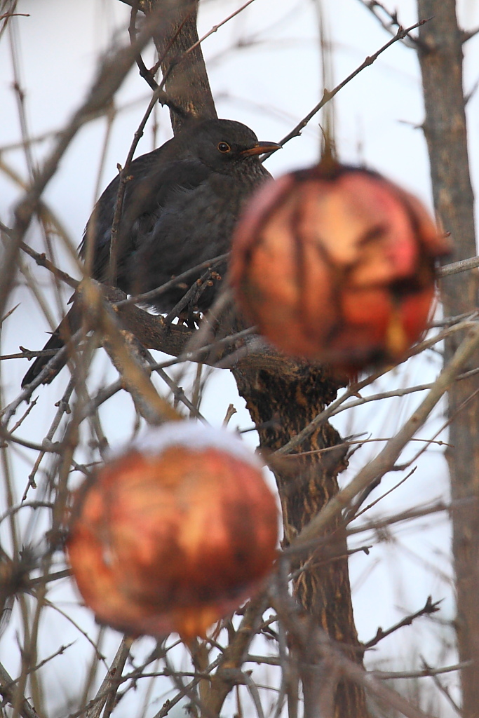 non parlo da esperto però forse i melograni sono troppo invasivi sulla foto e distolgono l'attenzione dal vero soggetto ovvero il merlo