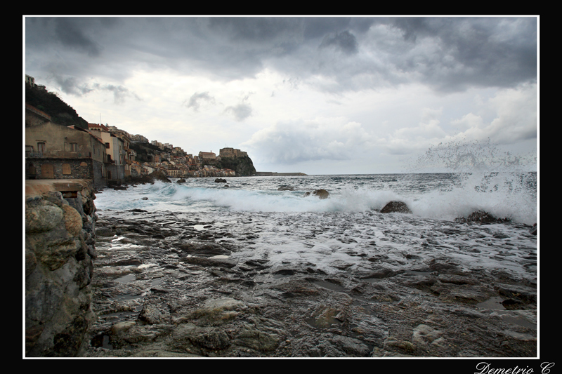 ......chiaro ed evidente la condizione atmosferica presenta al momento dello scatto....la luce bianca, il cielo grigio...il mare agitato con le sue onde... tutto porta a pensare ad una giornata fredda, uggiosa...invernale. A livello compositivo lo scatto appare dinamico e ben "sbilanciato", solo il muretto in pp appare come un elemento di disturbo a causa della sfocatura. Un'altra mancanza non di poco conto è che nel racconto da te proposto manca l'elemento chiave, il punto da guardare.. l'occhio si perde alla ricerca di qualcosa nell'agglomerato di case in lontananza, ma nulla riesce a spiccare in modo deciso......