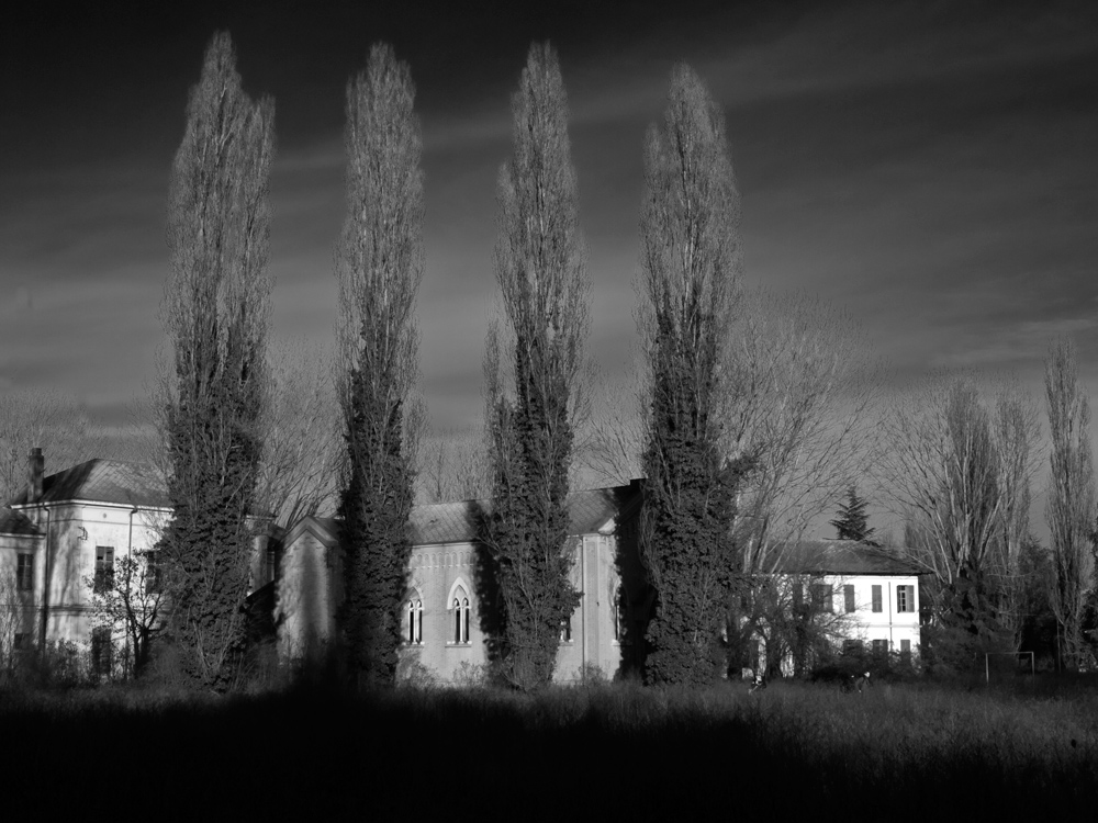 ...immagine ben composta che vede i quattro alberi fungere da centro di interesse della realizzazione. La luce appare decisamente alta, tanto che la facciata della costruzione di destra risulta decisamente fuori limite,mentre le fronde più alte degli alberi restituiscono una sensazione strana, come di recupero selettivo.....