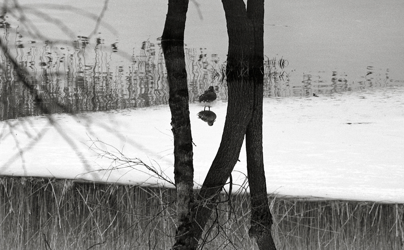 Mi piace molto per la costruzione geometrica, la divisione in zone scure all'estremità e la chiara centrale e soprattutto per quei tronchi così sinuosi che ben chiudono pennuto e il suo riflesso.