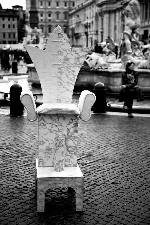 Il testo visivo senza l'aiuto del titolo non riesce a restituire il contenuto street intuito dall'autore. Viene naturale associare questa sedia vuota, probabilmente di un artista di strada, con la signora sullo sfondo, anch'essa in posizione seduta. Non emerge una ristrutturazione di quella realtà. Lo sfondo è molto ricco di dettagli architettonici e artistici con gli stessi toni di chiaro e scuro della sedia vuota in primo piano: questo produce una difficoltà interpretativa. Anche le zone sovraesposte della sedia e dello sfondo non risultano funzionali. Questo genere di scatti è abbastanza difficile: la selezione degli elementi visivi che partecipano all'immagine deve essere rigorosa ed esclusiva; inoltre devono essere ben organizzati in un contesto significativo ed autonomo, capace di restituire un contenuto street. Solo in seconda istanza il titolo può aiutare a dare una connotazione specifica al testo visivo.