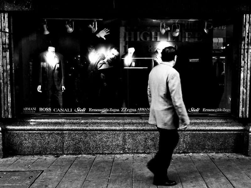 Questa istantane continua la valida serie di fotogrammi street cari all'autore dove si cerca l'interazione fra cartelloni e scenari urbani con l'uomo. In questo specifico frame orizzontale si evidenziano quattro aree chiare e sovraesposte che catturano in particolar modo l'attenzione dell'osservatore. Nella seconda a partire da sinistra, di queste quattro, è raffigurato un uomo in una postura e con un'espressione caratteristici che cercano l'interazione visiva con l'uomo, senza convincere troppo, forse a causa della posizione già avanzata di quest'ultimo sul marciapiede o forse per la direzione del suo sguardo già protesa in avanti. Degna di nota è comunque la tempestività di scatto che dimostra il nostro streepher, riuscendo a congelare la testa della figura in corrispondenza di una di quelle aree chiare, scongiurando il pericolo che i toni di nero andassero ad annullare la figura. La buona intuizione dell'autore viene a diluirsi lungo questa vetrina ben composta, dove i poli di quella interazione street sono disturbati da altri elementi visivi di pari attenzione: i manichini, le scritte di moda bianche su sfondo nero, le altre aree sovraesposte. Una buona intuizione che rispecchia l'occhio allenato dell'autore.