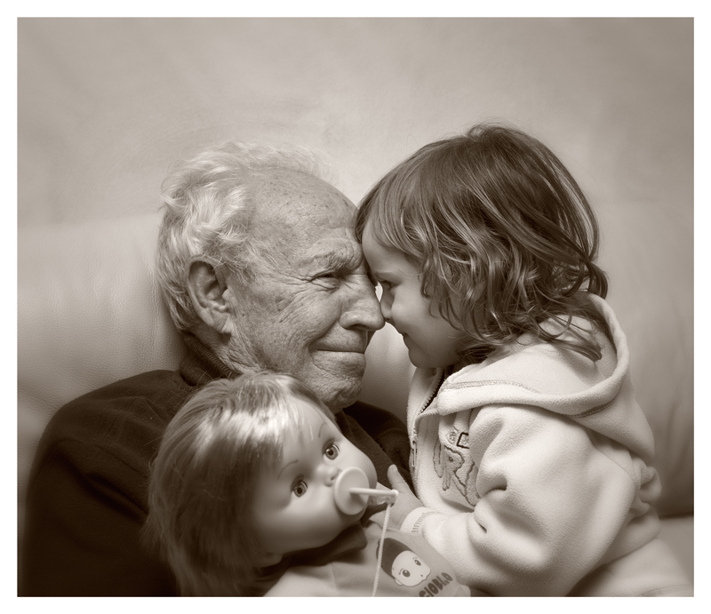 Ti dico sinceramente che il viraggio non mi convince fino in fondo, ma si tratta di una mio parere assolutamente personale, che nulla toglie alla delicatezza della esecuzione. Per quanto riguarda il tema, il suo svolgimento, la bellezza di questa complicità fra nonno e nipotina, con tanto di bambola a sdrammatizzare un po' e a far sorridere, a cacciare il pericolo di retorica sempre in agguato in questo genere di svolgimenti, mi hai convinto pienamente.