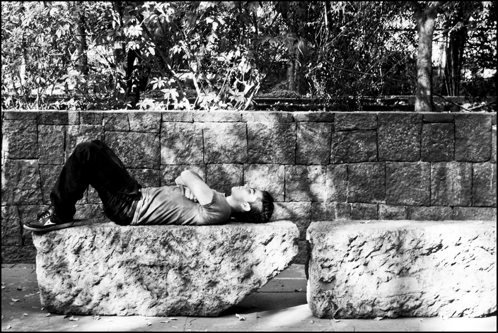 L'esposizione errata sulla roccia comporta a una considerazione: se il bianco/nero sia alla fine funzionale o meno alla riuscita dello scatto...cercavo una relazione fra la maglia del soggetto e le pareti di quelle particolari panchine, che però non riesco a individuare