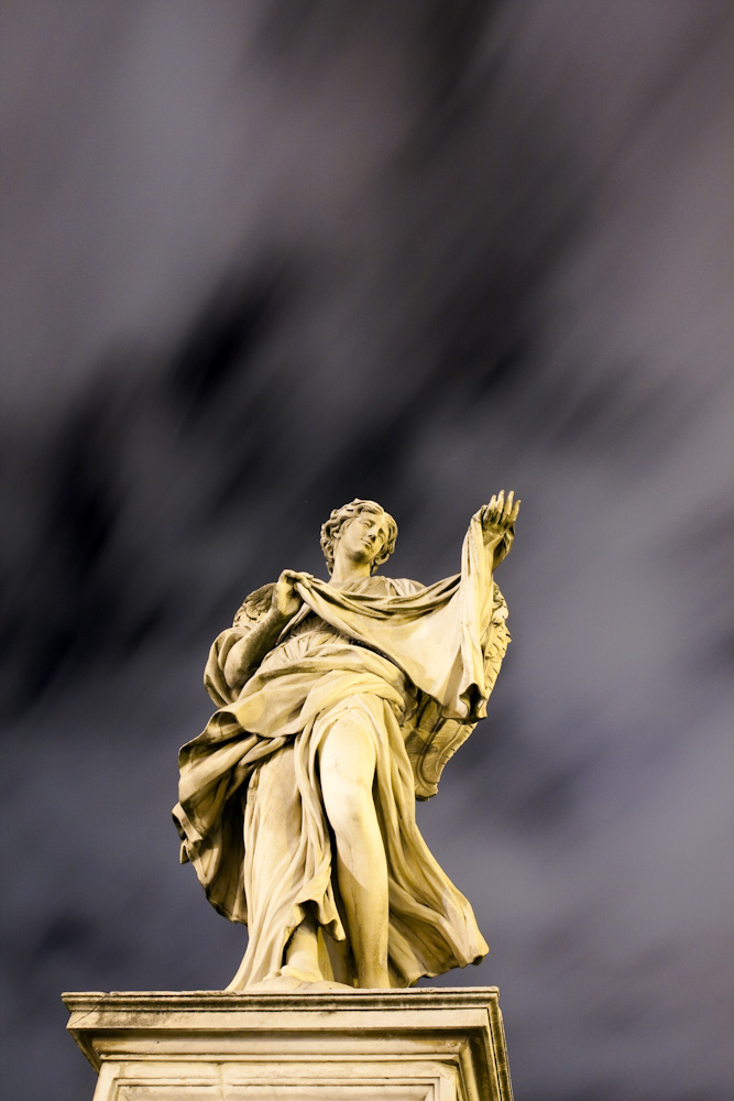 trovo interessante l'uso del tempo abbastanza lungo per catturare quel leggero movimento delle nuvole rese di quel colore dalla scarsa illuminazione.. peccato però che la forte illuminazione sulla statua e una non correttissima gestione dell'esposizione abbiano appiattito alcune zone del marmo, facendone perdere alcuni tratti caratteristici.. vedi sulla zona alta della gamba sinistra e sul panno teso dalla mano sinistra..