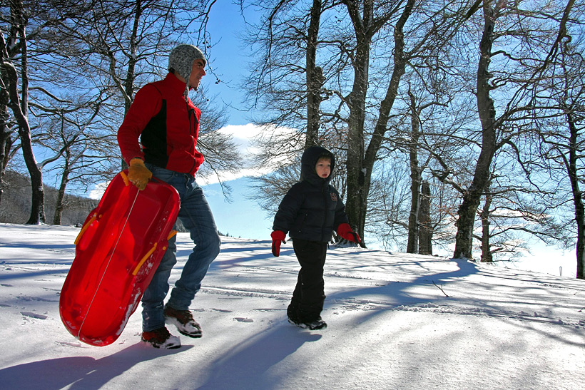 Una scena life ben composta, dove l'uomo e il suo ambiente convivono in proporzioni armoniose. La posizione delle due figure all'interno del frame è buona, con un adeguato spazio anteriore, rispettando quelle che sono le normali dinamiche di lettura del fotogramma, perlomeno nella nostra cultura occidentale. L'autore scieglie di rappresentare il movimento e l'azione di entrambi i personaggi, in accordo con le classificazioni temporali di Eugeni Ruggero (1999) con un movimento bloccato: l'immagine del padre e del bambino rappresenta una vera istantanea come se fosse stata bloccata in un istante preciso. Katia82 ha delle perplessità su questa posa: questo può sollevare una riflessione sulla domanda: quale istante sciegliere? Continua ancora Ruggeri a definire le modalità e le alternative di questo movimento che abbiamo definito "bloccato". Abbiamo principalmente tre alternative che possono essere illustrate grazie al concetto semiotico di aspettualizzazione, cioè detta in maniera più semplice, il modo in cui vengono descritti (l'aspetto sotto cui vengono colti, appunto) cose ed eventi. Il movimento potrà essere rappresentato nella sua fase iniziale (aspetto incoativo), nella sua fase intermedia, mentre cioè si svolge effettivamente (aspetto durativo) o, infine, nella sua fase finale (aspetto terminativo). In questo caso il padre è congelato nell'aspetto incoativo mentre il piccolo fanciullo nell'aspetto terminativo (sta per concludere il passo ed il suo piede stà per toccare il terreno). A dire la verità in questo genere di azioni non risulta essenziale ai fini contenutistici un momento preciso ed univoco quanto piuttosto per una questione di eleganza visiva. Se l'azione fosse stata più articolata, per esempio "il pugno di una persona nei confronti di un'avversario", riscontreremo diversi contenuti e diverse forme plastiche dell'azione a seconda dei momenti congelati. Ecco quindi che avremo il tirare indietro del braccio che è pronto a sferrare il pugno nel momento incoativo, oppure la corsa del pugno mentre colpisce l'avversario nell'aspetto durativo ed infine vedremo l'avversario cadere sbilanciato insieme al pugno che continua la sua estensione finale con il braccio nell'aspetto terminativo. In questo esempio cambiano molto i contenuti del testo visivo. Tornando all'istantanea, l'immagine mostra egregiamente la giornata di gioco di un giovane babbo con suo figlio, in una soleggiata giornata invernale. Traccie di sovraesposizione sulle nuvole e in corrispondenza del bordo destro del fotogramma.