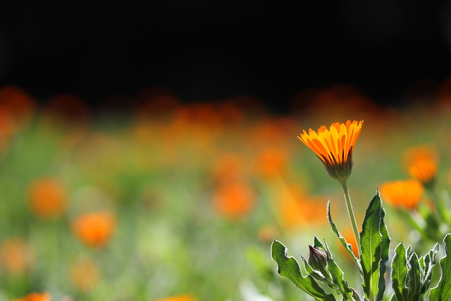Piacevole trasparenza dei petali di questa calendula, dove il controluce ha regalato ottime tonalità. Bello il contraltare formato dai fratelli sfocati.