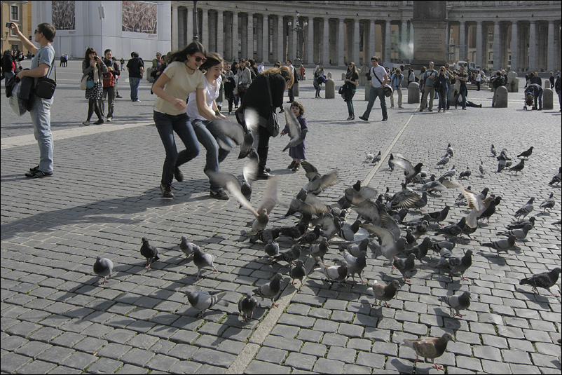 Un bello scatto, comunque. Mi piace molto il passetto in sincronia delle due ragazzine, scherzosamente spaventate dai piccioni.