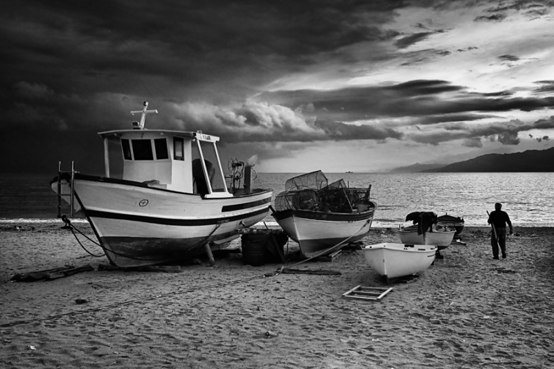 Il parallelo del cielo che si carica da sinistra a destra e il "percorso" uomo-barca a terra mi piace molto. |