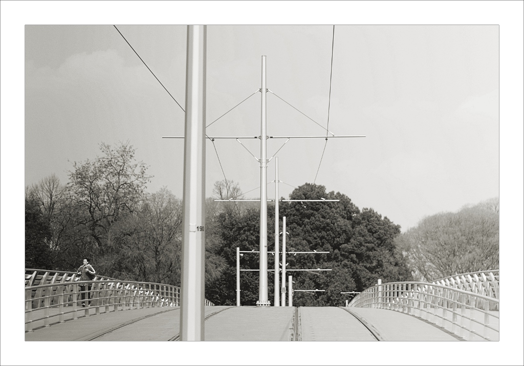 La composizione orizzontale appare equilibrata, con la prima linea verticale a tagliare il fotogramma nel terzo di sinistra, incorniciando bene l'elemento umano. Le geometrie dello scatto risentono di una lieve distorsione. Il bianco e nero è perfettibile: innanzitutto mancano i punti di nero e successivamente del contrasto.