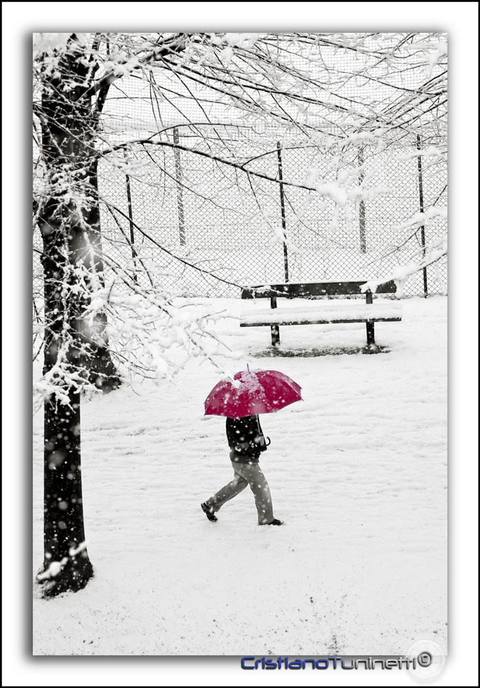 Avrei preferito un taglio orizontale e la magenta dell'ombrello avrei aggiunto un pò di giallo per avere un rosso vivo che focalizzerebbe maggiormente l'attenzione sul soggetto. Cosi mi pare che si perda un pò.