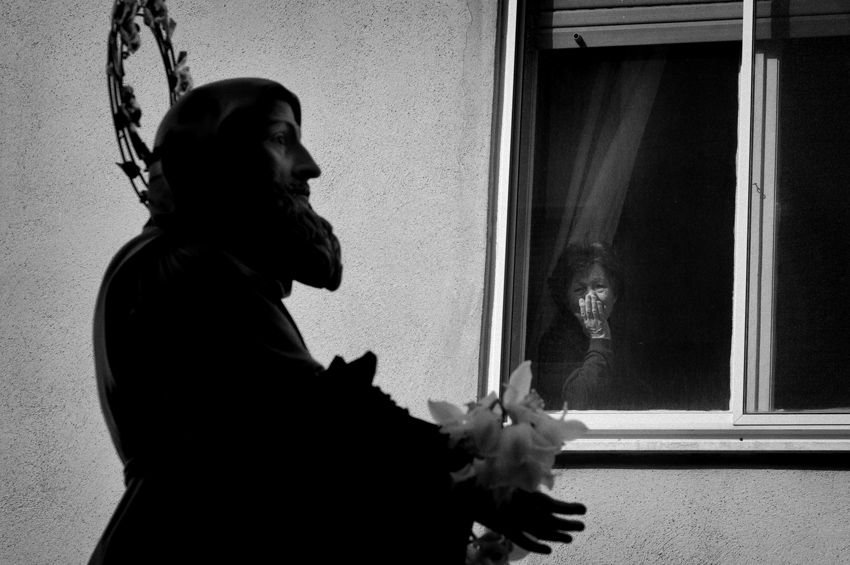 L'espressione della donna è in grado di raccontare in maniera inequivocabile il suo sentimento verso la processione che si sta svolgendo in strada.