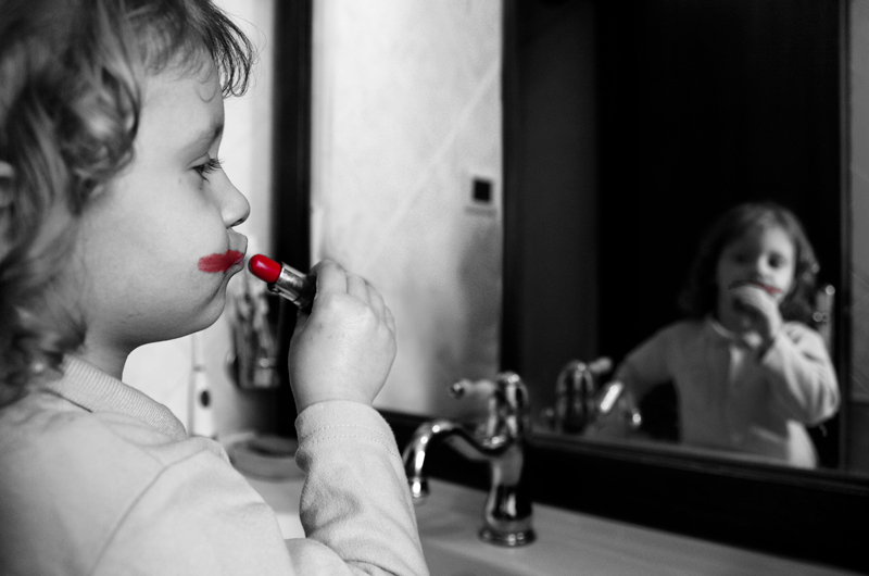 | non amo per niente le desaturazioni parziali, ma devo dire che in questo caso la post produzione ha un suo perchè: il rosso non è un colore qualsiasi del fotogramma, bensì è il colore del rossetto, che in sè racchiude tutto il fascino e l'attrazione che solo gli oggetti di una donna sanno esercitare su di una bambina, da sempre. |