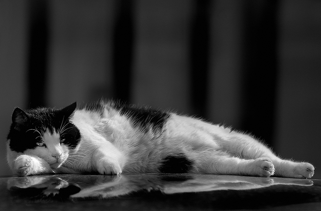 Molto bello questo riposino specchiato Wink , e mi piace anche il richiamo bitonale fra il mantello felino e la tapezzeria di sfondo.