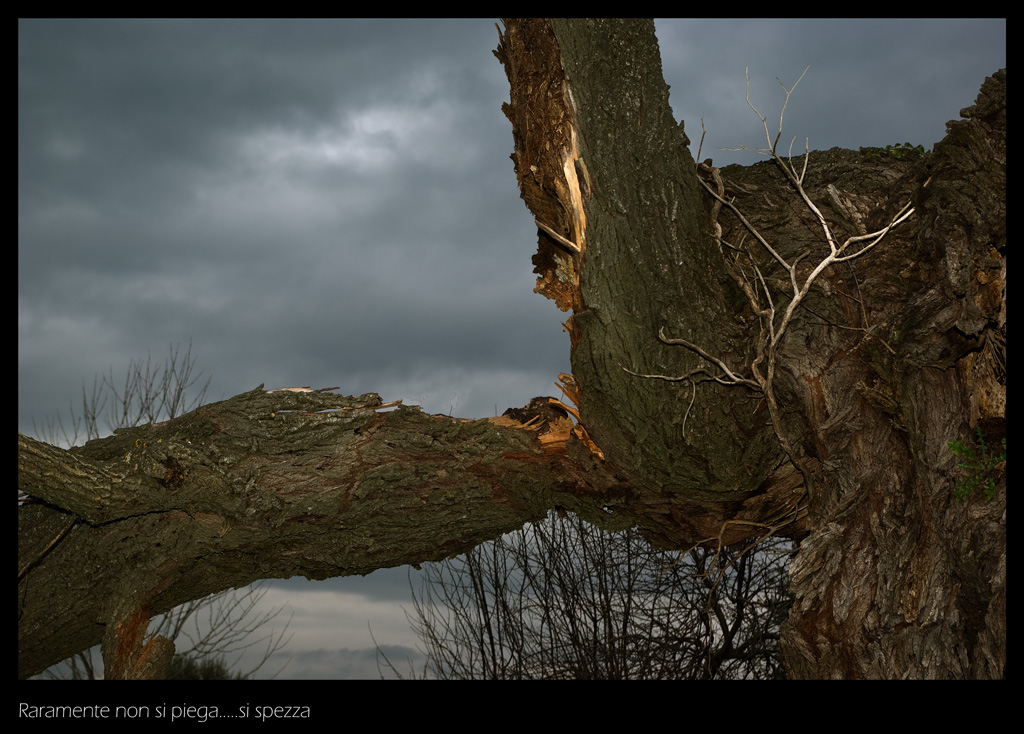 La scelta del punto di ripresa frontale restituisce una visione schematica dell'accaduto, per quanto, però, la mancanza di una linea visiva restituisca una lettura graficamente debole, per cui, qualora possibile, sarebbe stato utile sfruttare il profilo del ramo per indirizzare lo sguardo sul punto di rottura.