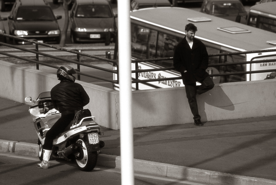 Quel palo rende ancor più funzionale la scena; la disposizione in serie di figure su piani paralleli le porta a confrontarle, a metterle in relazione. Il bianco del palo, viene a fondersi con la cornice provocando una dicotomia visiva e di contenuto. Questa è ulteriormente sottolineata dal cambiamento di inclinazione della ringhiera di metallo, in rima con la direzione della motocicletta, proprio in corrispondenza del palo stesso. Buono anche il momento dello scatto che congela la prima figura sulla sinistra con lo sguardo verso l'altro frame, come a presentare l'altra figura, sempre in attesa, ma con diverso ritmo e diversa prospettiva. Non la semplice accoppiata..