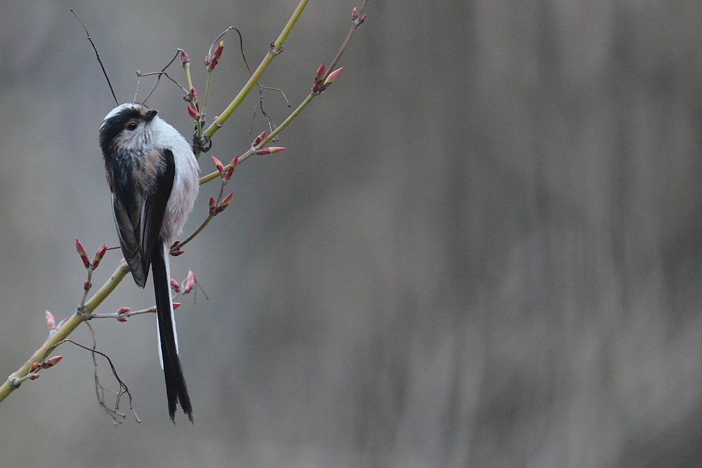 Mi piace moltissimo...sembra un panning naturale...come se il mondo scorresse veloce durante la sosta del piccolo pennuto...ripreso, tra l'altro molto bene...interessante la luce, quasi plumbea da nevicata che si contrappone al rosa delicato dei fiori...clonerei senza pietà il ramoscello che fa' capolino sulla testa dell'uccellino e quelli sfocati che penzolano in basso...