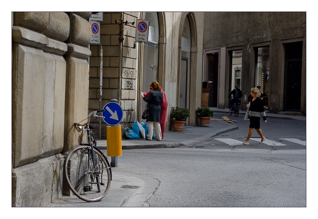 Un fotogramma con diversi centri di attrazione, arricchito dalle vivaci informazioni fornite dall'ottimo colore. Da sinistra verso destra abbiamo una vecchia bicicletta appoggiata al muro. Subito dopo una freccia direzionale bianca della segnaletica stradale introduce il primo vero centro d'interesse: un dialogo per strada fra due donne, con un biglietto davanti e una serie di buste di plastica: forse una delle due aveva bisogno di informazioni oppure controllavano la lista della spesa, scena aperta alle più svariate interpretazioni. Sulla destra abbiamo una donna che cammina spedita, ripresa molto bene nella sua estensione massima di passo: il suo vestito è caratteristico e riporta le stesse geometrie delle strisce pedonali che stà attraversando. Il colore grigio di questa fascia tenderebbe anche a fonderla visivamente con i limiti del marciapiede presente sullo sfondo se non fosse per l'interruzione visiva della borsa bianca e le distrazioni date dalle sovrapposizioni delle figure dei piani retrostanti. La composizione è curata nonostante i molteplici elementi da gestire: un abbassamento dell'intera inquadratura avrebbe eliminato dalla vista alcuni elementi di disturbo come i due segnali di divieto di sosta in alto, rendendo il frame più pulito. Lieve inclinazione a destra.