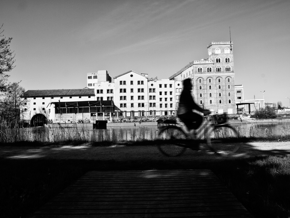 La scelta tecnica del chiaro e scuro comporta un alto valore visivo alla costruzione architettonica sullo sfondo del testo visivo che appare subito eccessivamente inclinata verso sinistra. I bianchi sono al limite sull'edificio di destra creando delle sovraesposizioni. La figura in bicicletta ripresa con un tempo relativamente lento per conferirgli un effetto mosso potrebbe essere interessante e creare un valido contrasto di contenuto con la fissità degli edifici dello sfondo. Purtroppo l'effetto è frenato dalla grande presenza di toni scuri del primo piano che tende ad inghiottirne le forme. Il risultato è un forte contrasto fra la metà superiore del fotogramma, chiarissima, e la metà inferiore, molto scura, che mette primariamente in evidenza i difetti sopramenzionati.