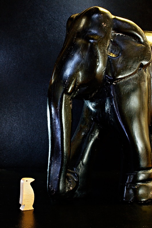 Il pinguino è stato scelto perché il più piccolo degli animaletti di legno e perché dalla postura mi sembrava quello che potesse "tener testa" al bestione nero.