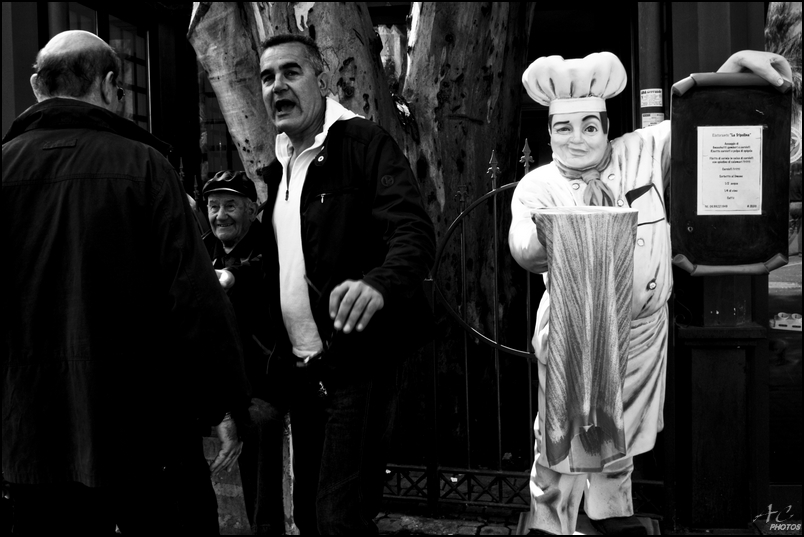 Una fotogramma dal buon potenziale dove gli ingredienti non sono stati sfruttati con la giusta ricetta. La scena appare slegata: lo sguardo in camera del pupazzo con il menù gastronomico strizza l'occhio allo spettatore come farebbe a qualsiasi passante di quella via. Non aggiungi niente di nuovo alla natura per il quale è stato già progettato. Forse una lieve somiglianza fra i due visi quadrati.. L''affiancamento alle altre figure sulla sinistra del fotogramma non sortisce effetti particolari: lo sguardo in camera del signore appare casuale, nascendo nel mezzo di un dialogo di strada dove mancano gli altri interlocutori. La bocca aperta e quel gesto plateale con gli occhiali, tradiscono un discorso interrotto, rivolto all'altra figura di spalle. E' come se lo spettatore si trovasse diviso fra due scene distinte e incompiute.