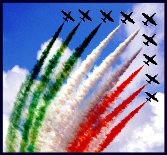 Bella foto, attentissima composizione e taglio, forse un po' troppo contrastata, e bruciacchiano le alte luci, ma bisognerebbe vedere la resa stampata per valutare al meglio. Non so fino a che punto può andar bene in artwork, il lavoro grafico lo fanno le frecce tricolore  |