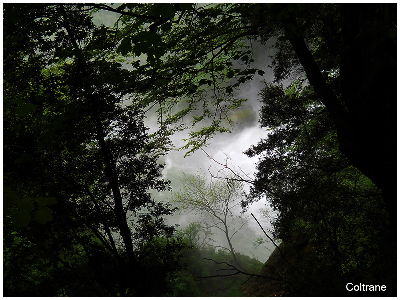 Al centro fotogramma, lo sparay luminoso di una cascata, sbocco limpido e