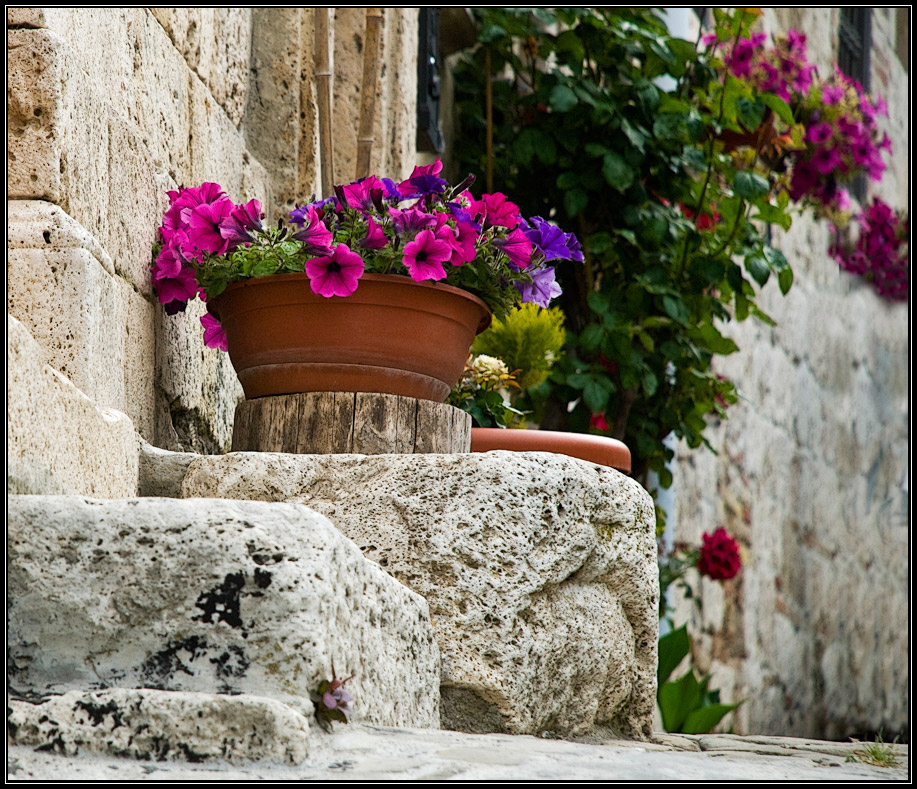 Una composizione che si sviluppa in diagonale seguendo un'ideale linea che dal travertino porta sino allo sfocato delle fioriere appese...