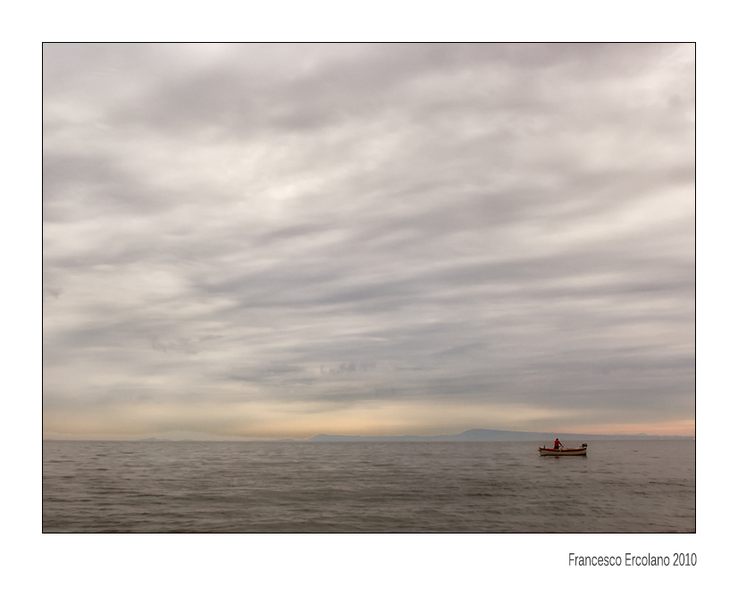 un cielo dalle mile tonalità di grigio per finire nel tenue rosa ll'orizzonte veglia su un accenno di profilo montuoso, su una calma marina solcata da una solitaria imbarcazione.