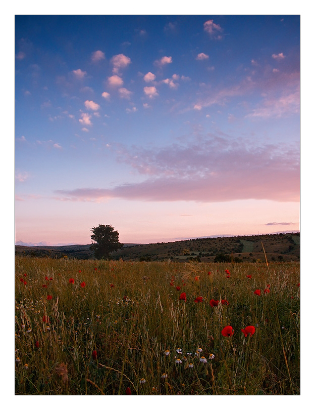 i petali rossi dei papaveri sulla terra, i batuffoli rosati delle nuvole nel cielo. è questa contrapposizione armonica che mi colpisce in questa immagine.
