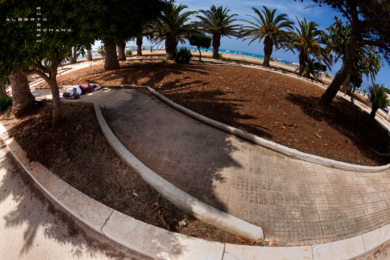 | La distorsione del fisheye diventa l'unico vero soggetto dello scatto enfatizzando le linee curve di questo scorcio marino. L'uomo è relegato a semplice componente compositiva. Da un punto di vista squisitamente Street and Life lo scatto è debole, senza nessun momento degno di essere fermato. |