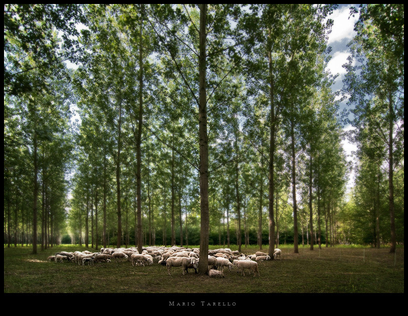 Bellissima la composizione, il rigore della geometricità quasi scenografica degli alberi contrapposta "all'ordine sparso" del gregge.