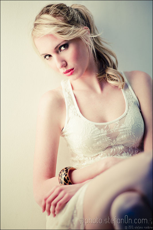 Davvero notevole... l'unica cosa che non mi convince è il taglio sul ginocchio, ma questo forse avrebbe fatto perdere di originalità e decentralità al soggetto, non saprei. Luce e viraggio molto ben studiati, così come la posa della modella.