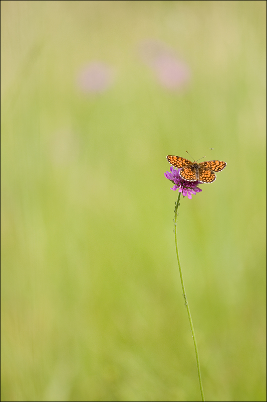 Una piccola delizia colorata, questo connubio fra il fiore e la farfalla. Ed una macro in potenza, se solo ci si fosse avvvicinati di più. Invece si è scelta la composizione armonica, la occuazione virtuale di un grande spazio solo con la delicatezza di una posa naturale. Forse avrei sacrificato un po' di spazio nella parte alta, là dove due strani occhi viola ci scrutano, per lascaire solo alla farfalla e al suo posatoio tutta la scena.