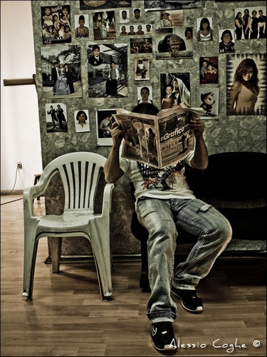 | Andrea Comelato ha scritto: | | Sarei stato fortemente tentato da un primo piano, magari abbassandomi un po' per coprire totalmente la testa del ragazzo con il giornale, come mai hai voluto includere la figura per intero? |