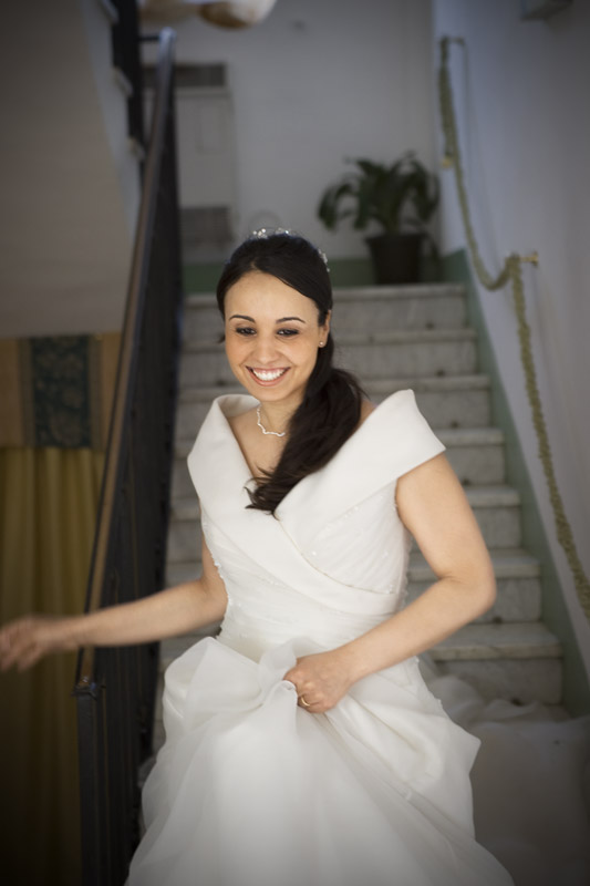bella espressione del viso che comunica felicità autentica, sicuramente addrizzerei la foto prendendo come riferimento i gradini della scala, valuterei anche un crop più stretto per ridurre tutto lo spazio superfluo sopra la testa.