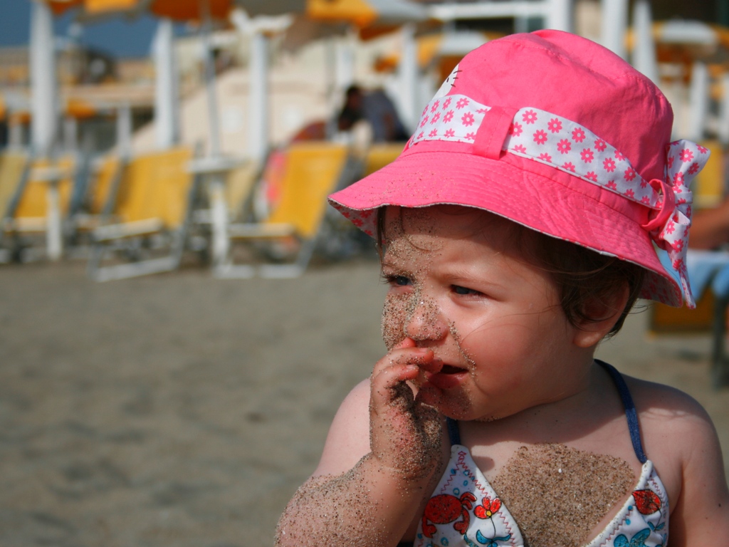 Putroppo il cappellino non posso toglierlo altrimenti mi cuoce la bimba , così come lo sfondo , devo portarla al mare di mattina così come sfondo posso usare il mare , dato che ho il sole alle spalle.
