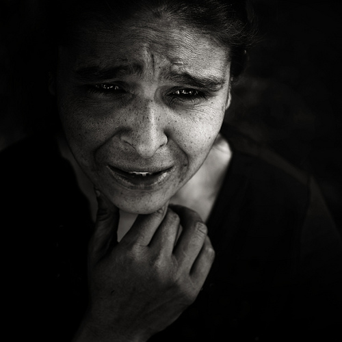 Il soggetto è una mendicante. L'espressione era quella che aveva nel momento in cui ho scattato. Se stesse fingendo non lo posso sapere, in ogni caso non era in posa per la foto...