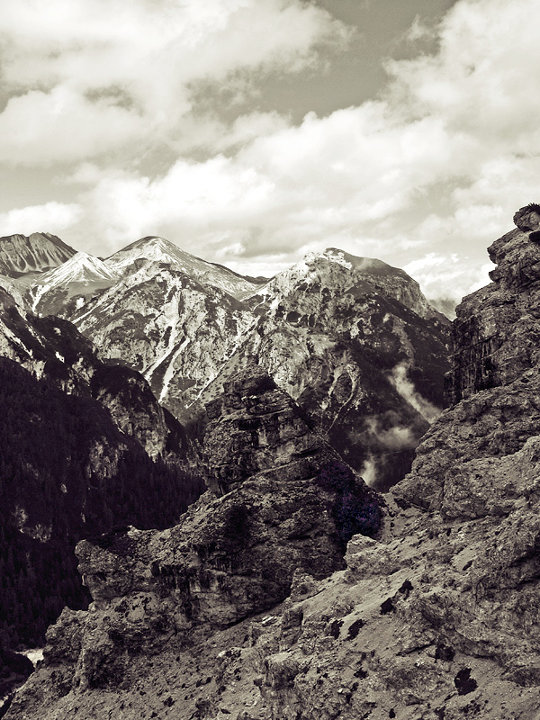 Bella...un primo piano brullo e selvaggio, le nuvole negli anfratti della montagna, che si erge maesosa sotto un cielo di nuvole leggere che alleggeriscono tutto il fotogramma, buono il viraggio  |