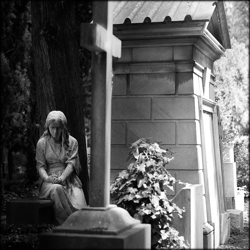 La dolcezza di quella figurina mesta immortalata nella pietra arriva tutta, il suo gesto chiaro ma raccolto sotto la penombra del grande tronco.... scevra da retorica, nonostante la scultura sia usata nel gesto e non eccelsa nella resa del tuttotondo.